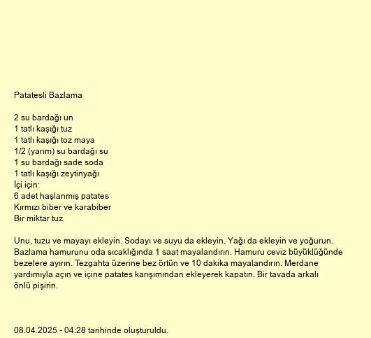 Unu, tuzu ve mayayı ekleyin. Sodayı ve suyu da ekleyin. Yağı da ekleyin ve yoğurun. Bazlama hamurunu oda sıcaklığında 1 saat mayalandırın. Hamuru ceviz büyüklüğünde bezelere ayırın. Tezgahta üzerine bez örtün ve 10 dakika mayalandırın. Merdane yardımıyla açın ve içine patates karışımından ekleyerek kapatın. Bir tavada arkalı önlü pişirin.