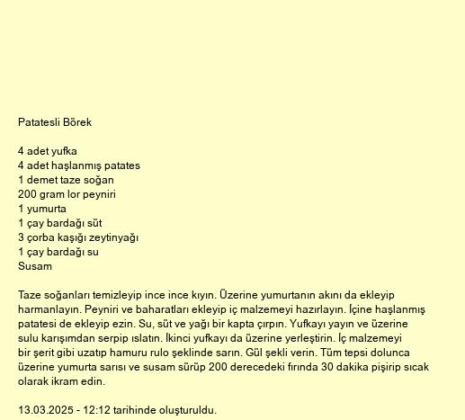 Taze soğanları temizleyip ince ince kıyın. Üzerine yumurtanın akını da ekleyip harmanlayın. Peyniri ve baharatları ekleyip iç malzemeyi hazırlayın. İçine haşlanmış patatesi de ekleyip ezin. Su, süt ve yağı bir kapta çırpın. Yufkayı yayın ve üzerine sulu karışımdan serpip ıslatın. İkinci yufkayı da üzerine yerleştirin. İç malzemeyi bir şerit gibi uzatıp hamuru rulo şeklinde sarın. Gül şekli verin. Tüm tepsi dolunca üzerine yumurta sarısı ve susam sürüp 200 derecedeki fırında 30 dakika pişirip sıcak olarak ikram edin.