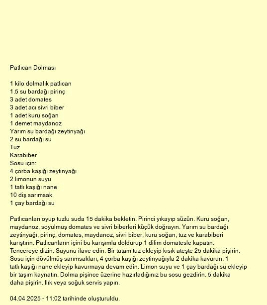 Patlıcanları oyup tuzlu suda 15 dakika bekletin. Pirinci yıkayıp süzün. Kuru soğan, maydanoz, soyulmuş domates ve sivri biberleri küçük doğrayın. Yarım su bardağı zeytinyağı, pirinç, domates, maydanoz, sivri biber, kuru soğan, tuz ve karabiberi karıştırın. Patlıcanların içini bu karışımla doldurup 1 dilim domatesle kapatın. Tencereye dizin. Suyunu ilave edin. Bir tutam tuz ekleyip kısık ateşte 25 dakika pişirin. Sosu için dövülmüş sarımsakları, 4 çorba kaşığı zeytinyağıyla 2 dakika kavurun. 1 tatlı kaşığı nane ekleyip kavurmaya devam edin. Limon suyu ve 1 çay bardağı su ekleyip bir taşım kaynatın. Dolma pişince üzerine hazırladığınız bu sosu gezdirin. 5 dakika daha pişirin. Ilık veya soğuk servis yapın.