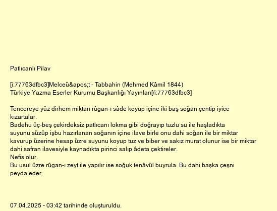 Tencereye yüz dirhem miktarı rûgan-ı sâde koyup içine iki baş soğan çentip iyice kızartalar.