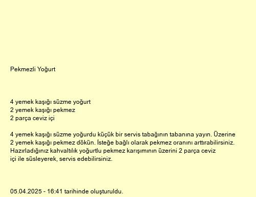 4 yemek kaşığı süzme yoğurdu küçük bir servis tabağının tabanına yayın. Üzerine 2 yemek kaşığı pekmez dökün. İsteğe bağlı olarak pekmez oranını arttırabilirsiniz. Hazırladığınız kahvaltılık yoğurtlu pekmez karışımının üzerini 2 parça ceviz içi ile süsleyerek, servis edebilirsiniz.