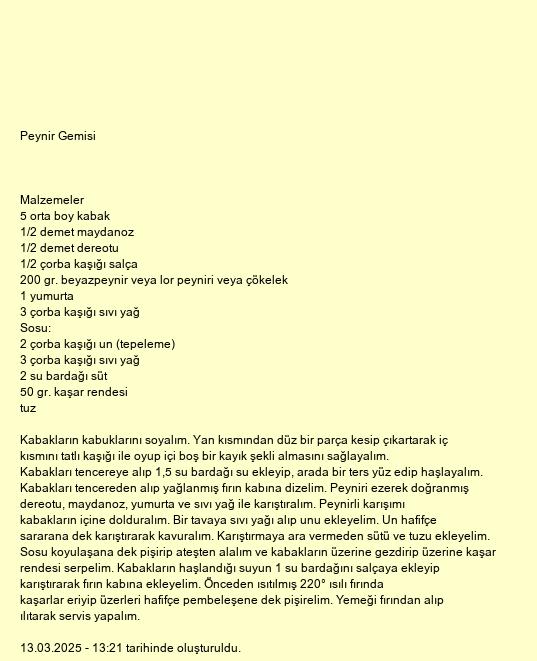 Kabakların kabuklarını soyalım. Yan kısmından düz bir parça kesip çıkartarak iç kısmını tatlı kaşığı ile oyup içi boş bir kayık şekli almasını sağlayalım. Kabakları tencereye alıp 1,5 su bardağı su ekleyip, arada bir ters yüz edip haşlayalım. Kabakları tencereden alıp yağlanmış fırın kabına dizelim. Peyniri ezerek doğranmış dereotu, maydanoz, yumurta ve sıvı yağ ile karıştıralım. Peynirli karışımı kabakların içine dolduralım. Bir tavaya sıvı yağı alıp unu ekleyelim. Un hafifçe sararana dek karıştırarak kavuralım. Karıştırmaya ara vermeden sütü ve tuzu ekleyelim. Sosu koyulaşana dek pişirip ateşten alalım ve kabakların üzerine gezdirip üzerine kaşar rendesi serpelim. Kabakların haşlandığı suyun 1 su bardağını salçaya ekleyip karıştırarak fırın kabına ekleyelim. Önceden ısıtılmış 220° ısılı fırında kaşarlar eriyip üzerleri hafifçe pembeleşene dek pişirelim. Yemeği fırından alıp ılıtarak servis yapalım.