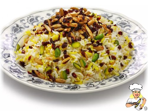 Pirinçleri ayıklayıp kaynar tuzlu suda 20 dakika bekletin. Soğanları irice doğrayın, margarin ile kavurun. Bekleyen pirinçleri yıkayıp süzün, fıstıklarla beraber soğana katın. Malzemeleri beş dakika kadar kavurun. Limon suyu, tuz, safran, şeker ve sıcak et suyunu ilave edin. Üzümleri yıkayıp ekleyin. Kaynamaya başlayınca tencerenin altını kısıp, pirinçler suyunu çekinceye kadar 20 dakika pişirin.