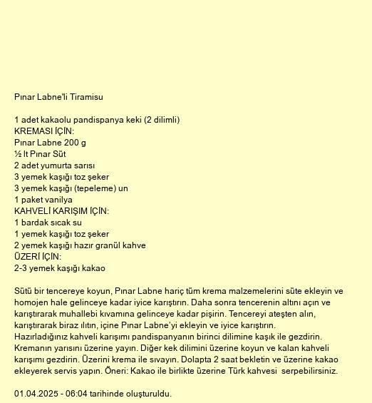 Sütü bir tencereye koyun, Pınar Labne hariç tüm krema malzemelerini süte ekleyin ve homojen hale gelinceye kadar iyice karıştırın. Daha sonra tencerenin altını açın ve karıştırarak muhallebi kıvamına gelinceye kadar pişirin. Tencereyi ateşten alın, karıştırarak biraz ılıtın, içine Pınar Labne’yi ekleyin ve iyice karıştırın. Hazırladığınız kahveli karışımı pandispanyanın birinci dilimine kaşık ile gezdirin. Kremanın yarısını üzerine yayın. Diğer kek dilimini üzerine koyun ve kalan kahveli karışımı gezdirin. Üzerini krema ile sıvayın. Dolapta 2 saat bekletin ve üzerine kakao ekleyerek servis yapın. Öneri: Kakao ile birlikte üzerine Türk kahvesi serpebilirsiniz.