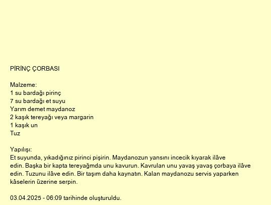 Et suyunda, yıkadığınız pirinci pişirin. Maydanozun yansını incecik kıyarak ilâve edin. Başka bir kapta tereyağmda unu kavurun. Kavrulan unu yavaş yavaş çorbaya ilâve edin. Tuzunu ilâve edin. Bir taşım daha kaynatın. Kalan maydanozu servis yaparken kâselerin üzerine serpin.