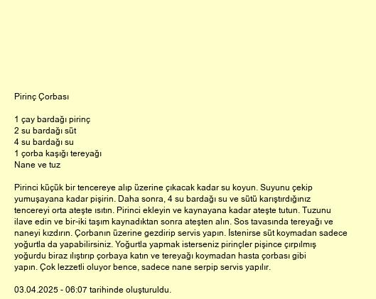 Pirinci küçük bir tencereye alıp üzerine çıkacak kadar su koyun. Suyunu çekip yumuşayana kadar pişirin. Daha sonra, 4 su bardağı su ve sütü karıştırdığınız tencereyi orta ateşte ısıtın. Pirinci ekleyin ve kaynayana kadar ateşte tutun. Tuzunu ilave edin ve bir-iki taşım kaynadıktan sonra ateşten alın. Sos tavasında tereyağı ve naneyi kızdırın. Çorbanın üzerine gezdirip servis yapın. İstenirse süt koymadan sadece yoğurtla da yapabilirsiniz. Yoğurtla yapmak isterseniz pirinçler pişince çırpılmış yoğurdu biraz ılıştırıp çorbaya katın ve tereyağı koymadan hasta çorbası gibi yapın. Çok lezzetli oluyor bence, sadece nane serpip servis yapılır.