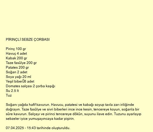 Soğanı yağda hafif kavurun. Havucu, patatesi ve kabağı soyup tavla zarı iriliğinde doğrayın. Taze fasülye ve sivri biberleri ince ince kesin, tencereye koyun, soğanla bir süre kavurun. Salçayı ve pirinci tencereye dökün, suyunu ilave edin. Tuzunu ayarlayıp sebzeler iyice yumuşayıncaya kadar pişirin.