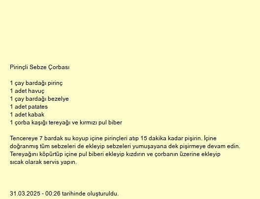 Tencereye 7 bardak su koyup içine pirinçleri atıp 15 dakika kadar pişirin. İçine doğranmış tüm sebzeleri de ekleyip sebzeleri yumuşayana dek pişirmeye devam edin. Tereyağını köpürtüp içine pul biberi ekleyip kızdırın ve çorbanın üzerine ekleyip sıcak olarak servis yapın.