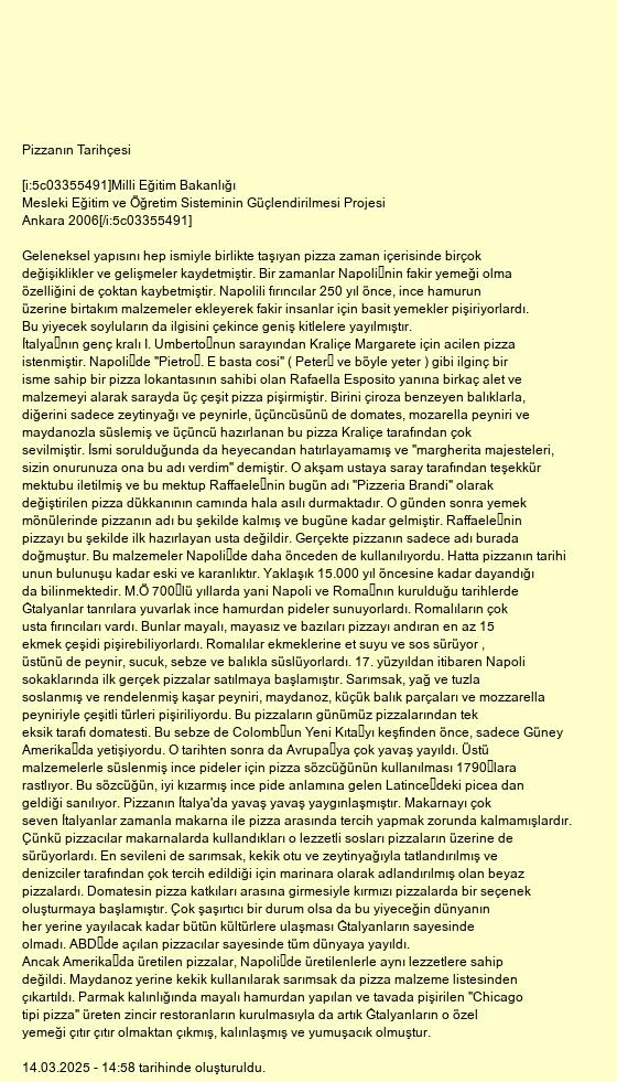 ve böyle yeter ) gibi ilginç bir isme sahip bir pizza lokantasının sahibi olan Rafaella Esposito yanına birkaç alet ve malzemeyi alarak sarayda üç çeşit pizza pişirmiştir. Birini çiroza benzeyen balıklarla, diğerini sadece zeytinyağı ve peynirle, üçüncüsünü de domates, mozarella peyniri ve maydanozla süslemiş ve üçüncü hazırlanan bu pizza Kraliçe tarafından çok sevilmiştir. İsmi sorulduğunda da heyecandan hatırlayamamış ve "margherita majesteleri, sizin onurunuza ona bu adı verdim" demiştir. O akşam ustaya saray tarafından teşekkür mektubu iletilmiş ve bu mektup Raffaelenin bugün adı "Pizzeria Brandi" olarak değiştirilen pizza dükkanının camında hala asılı durmaktadır. O günden sonra yemek mönülerinde pizzanın adı bu şekilde kalmış ve bugüne kadar gelmiştir. Raffaelenin pizzayı bu şekilde ilk hazırlayan usta değildir. Gerçekte pizzanın sadece adı burada doğmuştur. Bu malzemeler Napolide daha önceden de kullanılıyordu. Hatta pizzanın tarihi unun bulunuşu kadar eski ve karanlıktır. Yaklaşık 15.000 yıl öncesine kadar dayandığı da bilinmektedir. M.Ö 700lü yıllarda yani Napoli ve Romanın kurulduğu tarihlerde Ġtalyanlar tanrılara yuvarlak ince hamurdan pideler sunuyorlardı. Romalıların çok usta fırıncıları vardı. Bunlar mayalı, mayasız ve bazıları pizzayı andıran en az 15 ekmek çeşidi pişirebiliyorlardı. Romalılar ekmeklerine et suyu ve sos sürüyor , üstünü de peynir, sucuk, sebze ve balıkla süslüyorlardı. 17. yüzyıldan itibaren Napoli sokaklarında ilk gerçek pizzalar satılmaya başlamıştır. Sarımsak, yağ ve tuzla soslanmış ve rendelenmiş kaşar peyniri, maydanoz, küçük balık parçaları ve mozzarella peyniriyle çeşitli türleri pişiriliyordu. Bu pizzaların günümüz pizzalarından tek eksik tarafı domatesti. Bu sebze de Colombun Yeni Kıtayı keşfinden önce, sadece Güney Amerikada yetişiyordu. O tarihten sonra da Avrupaya çok yavaş yayıldı. Üstü malzemelerle süslenmiş ince pideler için pizza sözcüğünün kullanılması 1790lara rastlıyor. Bu sözcüğün, iyi kızarmış ince pide anlamına gelen Latincedeki picea dan geldiği sanılıyor. Pizzanın İtalya'da yavaş yavaş yaygınlaşmıştır. Makarnayı çok seven İtalyanlar zamanla makarna ile pizza arasında tercih yapmak zorunda kalmamışlardır. Çünkü pizzacılar makarnalarda kullandıkları o lezzetli sosları pizzaların üzerine de sürüyorlardı. En sevileni de sarımsak, kekik otu ve zeytinyağıyla tatlandırılmış ve denizciler tarafından çok tercih edildiği için marinara olarak adlandırılmış olan beyaz pizzalardı. Domatesin pizza katkıları arasına girmesiyle kırmızı pizzalarda bir seçenek oluşturmaya başlamıştır. Çok şaşırtıcı bir durum olsa da bu yiyeceğin dünyanın her yerine yayılacak kadar bütün kültürlere ulaşması Ġtalyanların sayesinde olmadı. ABDde açılan pizzacılar sayesinde tüm dünyaya yayıldı.