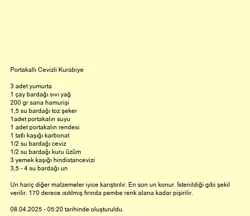 Un hariç diğer malzemeler iyice karıştırılır. En son un konur. İstenildiği gibi şekil verilir. 170 derece ısıtılmış fırında pembe renk alana kadar pişirilir.
