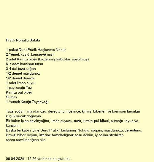 Başka bir kabın içine Duru Pratik Haşlanmış Nohutu, soğanı, maydanozu, dereotunu, kırmızı biberi koyun, üzerine hazırladığınız sosu dökün, iyice karıştırdıktan sonra servi tabağına alın.