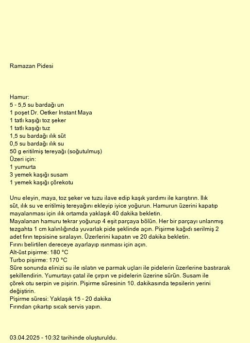 Mayalanan hamuru tekrar yoğurup 4 eşit parçaya bölün. Her bir parçayı unlanmış tezgahta 1 cm kalınlığında yuvarlak pide şeklinde açın. Pişirme kağıdı serilmiş 2 adet fırın tepsisine sıralayın. Üzerlerini kapatın ve 20 dakika bekletin.