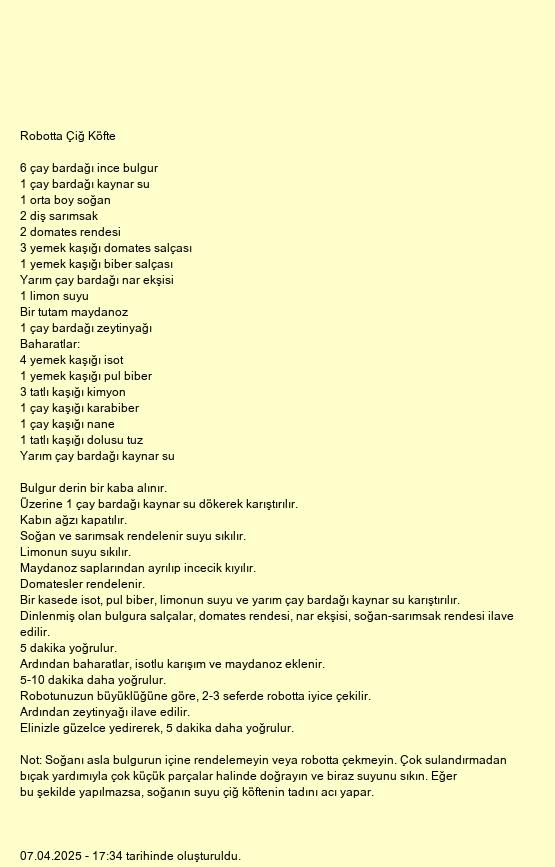 Not: Soğanı asla bulgurun içine rendelemeyin veya robotta çekmeyin. Çok sulandırmadan bıçak yardımıyla çok küçük parçalar halinde doğrayın ve biraz suyunu sıkın. Eğer bu şekilde yapılmazsa, soğanın suyu çiğ köftenin tadını acı yapar.
