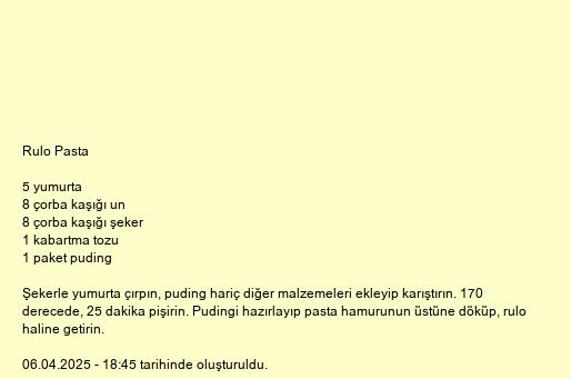 Şekerle yumurta çırpın, puding hariç diğer malzemeleri ekleyip karıştırın. 170 derecede, 25 dakika pişirin. Pudingi hazırlayıp pasta hamurunun üstüne döküp, rulo haline getirin.