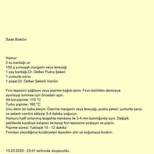 Hamuru hafif unlanmış tezgahta merdane ile 3-4 mm kalınlığında açın. Değişik şekillerde kurabiye kalıpları ile kesip fırın tepsisine sıralayın ve pişirin.