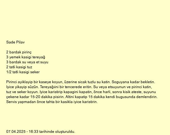 Pirinci ayiklayip bir kaseye koyun, üzerine sicak tuzlu su katin. Soguyana kadar bekletin. Iyice yikayip süzün. Tereyağıini bir tencerede eritin. Su veya etsuyunun ve pirinci katin, tuz ve seker koyun. Iyice karistirip kapagini kapatin, önce harli, sonra kisik ateste, suyunu çekene kadar 15-20 dakika pisirin. Altini kapatip 15 dakika kendi bugusunda demlendirin.