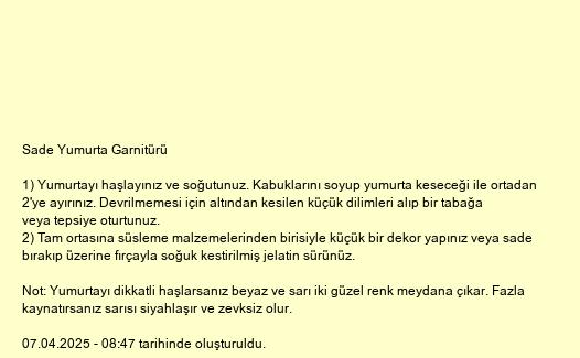 Not: Yumurtayı dikkatli haşlarsanız beyaz ve sarı iki güzel renk meydana çıkar. Fazla kaynatırsanız sarısı siyahlaşır ve zevksiz olur.