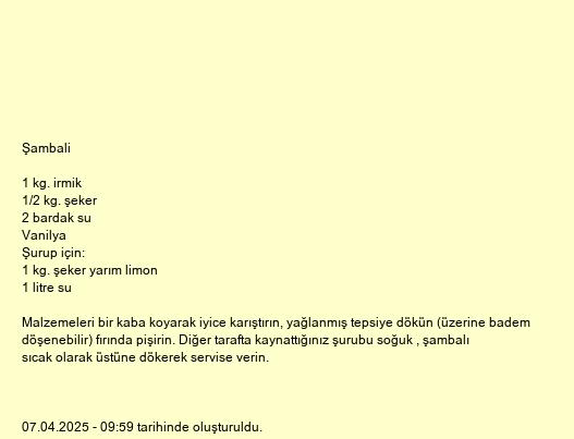 Malzemeleri bir kaba koyarak iyice karıştırın, yağlanmış tepsiye dökün (üzerine badem döşenebilir) fırında pişirin. Diğer tarafta kaynattığınız şurubu soğuk , şambalı sıcak olarak üstüne dökerek servise verin.