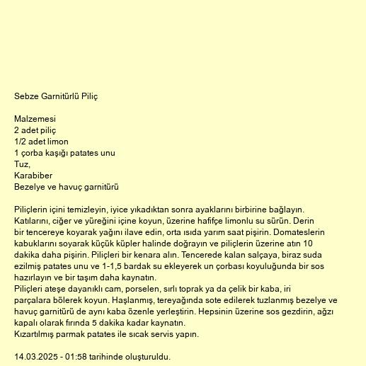 Piliçleri ateşe dayanıklı cam, porselen, sırlı toprak ya da çelik bir kaba, iri parçalara bölerek koyun. Haşlanmış, tereyağında sote edilerek tuzlanmış bezelye ve havuç garnitürü de aynı kaba özenle yerleştirin. Hepsinin üzerine sos gezdirin, ağzı kapalı olarak fırında 5 dakika kadar kaynatın.