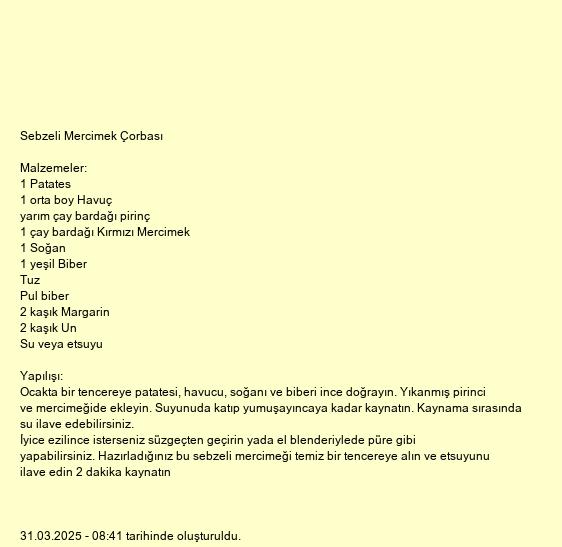 Ocakta bir tencereye patatesi, havucu, soğanı ve biberi ince doğrayın. Yıkanmış pirinci ve mercimeğide ekleyin. Suyunuda katıp yumuşayıncaya kadar kaynatın. Kaynama sırasında su ilave edebilirsiniz.