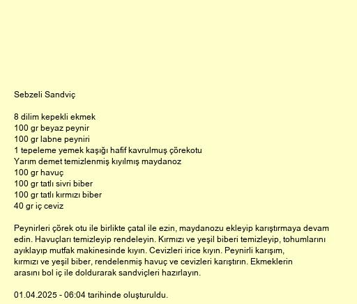 Peynirleri çörek otu ile birlikte çatal ile ezin, maydanozu ekleyip karıştırmaya devam edin. Havuçları temizleyip rendeleyin. Kırmızı ve yeşil biberi temizleyip, tohumlarını ayıklayıp mutfak makinesinde kıyın. Cevizleri irice kıyın. Peynirli karışım, kırmızı ve yeşil biber, rendelenmiş havuç ve cevizleri karıştırın. Ekmeklerin arasını bol iç ile doldurarak sandviçleri hazırlayın.