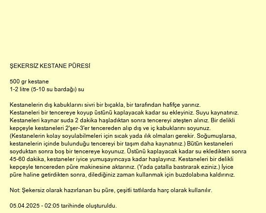 Not: Şekersiz olarak hazırlanan bu püre, çeşitli tatlılarda harç olarak kullanılır.