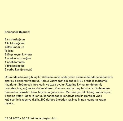 Unun ortası havuz gibi açılır. Ortasına un ve serte yakın kıvam elde edene kadar azar azar su eklenerek yoğrulur. Hamur yarım saat dinlendirilir. Bu arada iç malzeme hazırlanır. Soğan çok ince kıyılır ve tuzla ovulur. Üzerine kıyma, rendelenmiş domates, tuz, yağ ve karabiber eklenir. Kıvamı cıvık bir harç hazırlanır. Dinlenenen hamurdan cevizdan biraz büyük parçalar alınır. Merdaneyle tatlı tabağı kadar açılır. Yarısına yeteri kadar iç konur, kenarı tabağın kenarıyla kesilir. Börekler yağlı kağıt serilmiş tepsiye dizilir. 200 derece önceden ısıtılmış fırında kızarana kadar pişirilir.