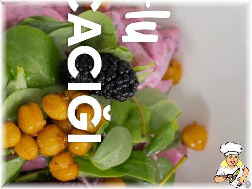 Semizotlu Makarna Cacığını semizotu, kızarmış nohut, karadut ve zeytinyağı ile birlikte servis ediyoruz.