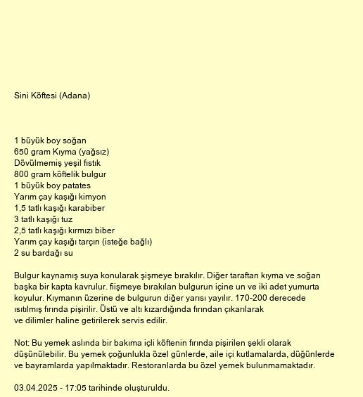 Not: Bu yemek aslında bir bakıma içli köftenin fırında pişirilen şekli olarak düşünülebilir. Bu yemek çoğunlukla özel günlerde, aile içi kutlamalarda, düğünlerde ve bayramlarda yapılmaktadır. Restoranlarda bu özel yemek bulunmamaktadır.