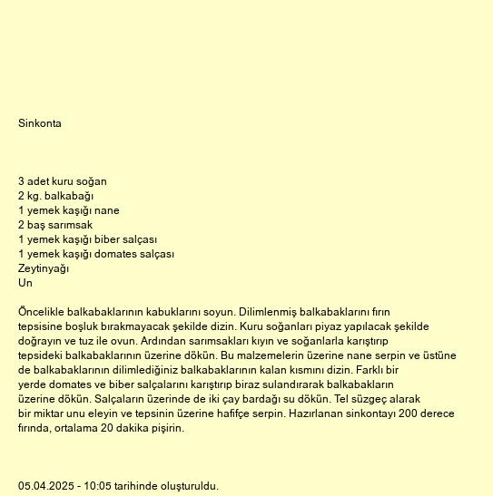 Öncelikle balkabaklarının kabuklarını soyun. Dilimlenmiş balkabaklarını fırın tepsisine boşluk bırakmayacak şekilde dizin. Kuru soğanları piyaz yapılacak şekilde doğrayın ve tuz ile ovun. Ardından sarımsakları kıyın ve soğanlarla karıştırıp tepsideki balkabaklarının üzerine dökün. Bu malzemelerin üzerine nane serpin ve üstüne de balkabaklarının dilimlediğiniz balkabaklarının kalan kısmını dizin. Farklı bir yerde domates ve biber salçalarını karıştırıp biraz sulandırarak balkabakların üzerine dökün. Salçaların üzerinde de iki çay bardağı su dökün. Tel süzgeç alarak bir miktar unu eleyin ve tepsinin üzerine hafifçe serpin. Hazırlanan sinkontayı 200 derece fırında, ortalama 20 dakika pişirin.