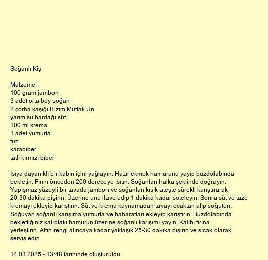 Isıya dayanıklı bir kabın içini yağlayın. Hazır ekmek hamurunu yayıp buzdolabında bekletin. Fırını önceden 200 dereceye ısıtın. Soğanları halka şeklinde doğrayın. Yapışmaz yüzeyli bir tavada jambon ve soğanları kısık ateşte sürekli karıştırarak 20-30 dakika pişirin. Üzerine unu ilave edip 1 dakika kadar soteleyin. Sonra süt ve taze kremayı ekleyip karıştırın. Süt ve krema kaynamadan tavayı ocaktan alıp soğutun. Soğuyan soğanlı karışıma yumurta ve baharatları ekleyip karıştırın. Buzdolabında beklettiğiniz kalıptaki hamurun üzerine soğanlı karışımı yayın. Kalıbı fırına yerleştirin. Altın rengi alıncaya kadar yaklaşık 25-30 dakika pişirin ve sıcak olarak servis edin.