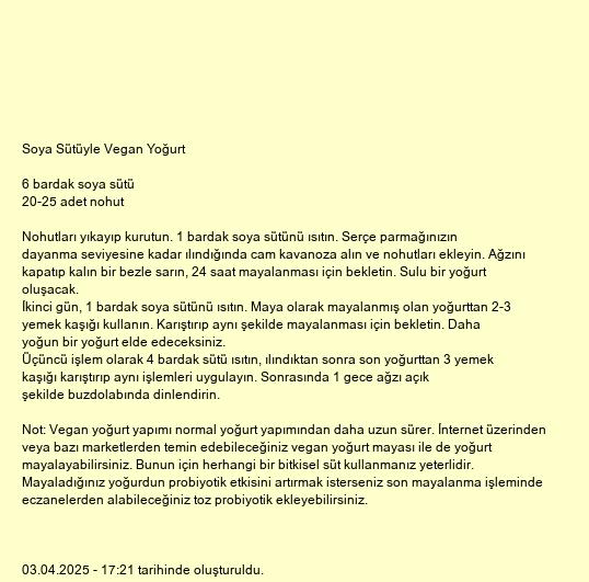 Not: Vegan yoğurt yapımı normal yoğurt yapımından daha uzun sürer. İnternet üzerinden veya bazı marketlerden temin edebileceğiniz vegan yoğurt mayası ile de yoğurt mayalayabilirsiniz. Bunun için herhangi bir bitkisel süt kullanmanız yeterlidir. Mayaladığınız yoğurdun probiyotik etkisini artırmak isterseniz son mayalanma işleminde eczanelerden alabileceğiniz toz probiyotik ekleyebilirsiniz.