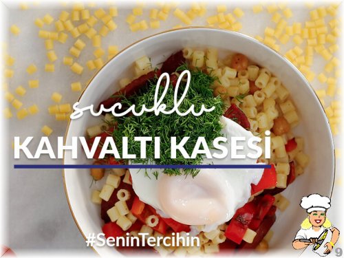 Sucuklu makarnamızı poşe yumurta ve kıyılmış dereotu ile birlikte servis ediyoruz.