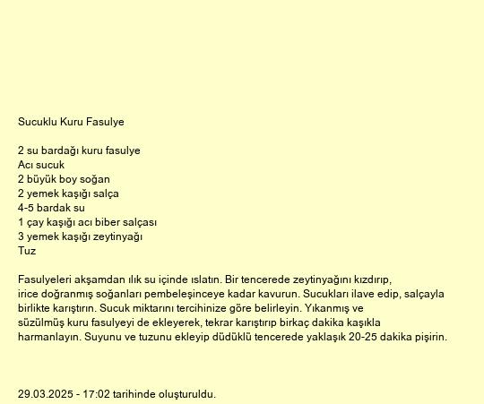 Fasulyeleri akşamdan ılık su içinde ıslatın. Bir tencerede zeytinyağını kızdırıp, irice doğranmış soğanları pembeleşinceye kadar kavurun. Sucukları ilave edip, salçayla birlikte karıştırın. Sucuk miktarını tercihinize göre belirleyin. Yıkanmış ve süzülmüş kuru fasulyeyi de ekleyerek, tekrar karıştırıp birkaç dakika kaşıkla harmanlayın. Suyunu ve tuzunu ekleyip düdüklü tencerede yaklaşık 20-25 dakika pişirin.