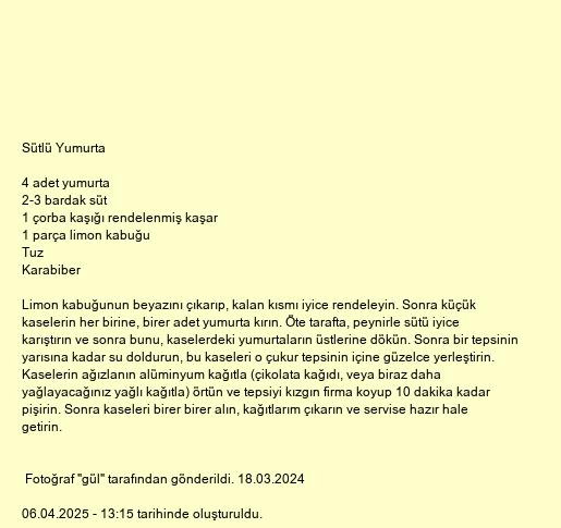 Limon kabuğunun beyazını çıkarıp, kalan kısmı iyice rendeleyin. Sonra küçük kaselerin her birine, birer adet yumurta kırın. Öte tarafta, peynirle sütü iyice karıştırın ve sonra bunu, kaselerdeki yumurtaların üstlerine dökün. Sonra bir tepsinin yarısına kadar su doldurun, bu kaseleri o çukur tepsinin içine güzelce yerleştirin. Kaselerin ağızlanın alüminyum kağıtla (çikolata kağıdı, veya biraz daha yağlayacağınız yağlı kağıtla) örtün ve tepsiyi kızgın firma koyup 10 dakika kadar pişirin. Sonra kaseleri birer birer alın, kağıtlarım çıkarın ve servise hazır hale getirin.