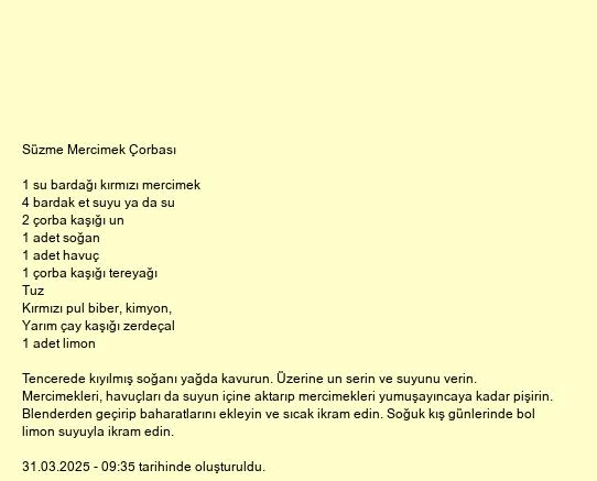 Tencerede kıyılmış soğanı yağda kavurun. Üzerine un serin ve suyunu verin. Mercimekleri, havuçları da suyun içine aktarıp mercimekleri yumuşayıncaya kadar pişirin. Blenderden geçirip baharatlarını ekleyin ve sıcak ikram edin. Soğuk kış günlerinde bol limon suyuyla ikram edin.