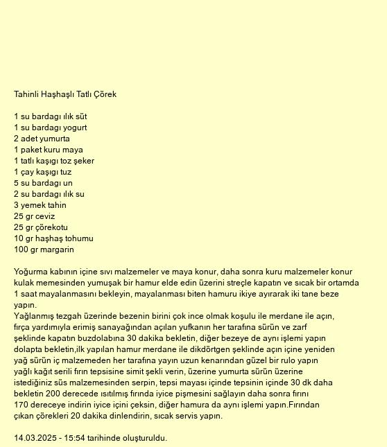 Yağlanmış tezgah üzerinde bezenin birini çok ince olmak koşulu ile merdane ile açın, fırça yardımıyla erimiş sanayağından açılan yufkanın her tarafına sürün ve zarf şeklinde kapatın buzdolabına 30 dakika bekletin, diğer bezeye de aynı işlemi yapın dolapta bekletin,ilk yapılan hamur merdane ile dikdörtgen şeklinde açın içine yeniden yağ sürün iç malzemeden her tarafına yayın uzun kenarından güzel bir rulo yapın yağlı kağıt serili fırın tepsisine simit şekli verin, üzerine yumurta sürün üzerine istediğiniz süs malzemesinden serpin, tepsi mayası içinde tepsinin içinde 30 dk daha bekletin 200 derecede ısıtılmış fırında iyice pişmesini sağlayın daha sonra fırını 170 dereceye indirin iyice içini çeksin, diğer hamura da aynı işlemi yapın.Fırından çıkan çörekleri 20 dakika dinlendirin, sıcak servis yapın.
