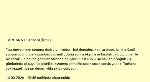 Yaz mevsiminin sonuna doğru un, yoğurt, bol domates, kırmızı biber, İzmir’e özgü yabani otlar önce kazanlarda pişirilir, daha sonra ekşimeye bırakılır, kurutulur, el ile ovularak, un haline getirilen tarhanalar, iyice kurutulup, kışa saklanır.Soğuk kış günlerinde et suyu ile pişirilip, kızarmış ekmekle sıcak sıcak servis yapılır. Tarhana çok lezzetli, besin değeri yüksek bir çorbadır.