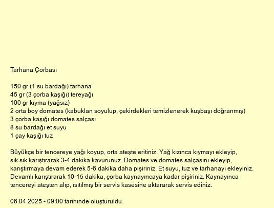 Büyükçe bir tencereye yağı koyup, orta ateşte eritiniz. Yağ kızınca kıymayı ekleyip, sık sık karıştırarak 3-4 dakika kavurunuz. Domates ve domates salçasını ekleyip, karıştırmaya devam ederek 5-6 dakika daha pişiriniz. Et suyu, tuz ve tarhanayı ekleyiniz. Devamlı karıştırarak 10-15 dakika, çorba kaynayıncaya kadar pişiriniz. Kaynayınca tencereyi ateşten alıp, ısıtılmış bir servis kasesine aktararak servis ediniz.