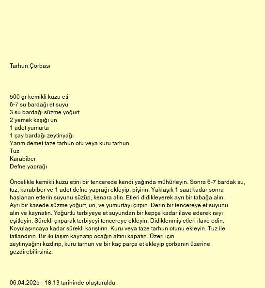 Öncelikle kemikli kuzu etini bir tencerede kendi yağında mühürleyin. Sonra 6-7 bardak su, tuz, karabiber ve 1 adet defne yaprağı ekleyip, pişirin. Yaklaşık 1 saat kadar sonra haşlanan etlerin suyunu süzüp, kenara alın. Etleri didikleyerek ayrı bir tabağa alın. Ayrı bir kasede süzme yoğurt, un, ve yumurtayı çırpın. Derin bir tencereye et suyunu alın ve kaynatın. Yoğurtlu terbiyeye et suyundan bir kepçe kadar ilave ederek ısıyı eşitleyin. Sürekli çırparak terbiyeyi tencereye ekleyin. Didiklenmiş etleri ilave edin. Koyulaşıncaya kadar sürekli karıştırın. Kuru veya taze tarhun otunu ekleyin. Tuz ile tatlandırın. Bir iki taşım kaynatıp ocağın altını kapatın. Üzeri için zeytinyağını kızdırıp, kuru tarhun ve bir kaç parça et ekleyip çorbanın üzerine gezdirebilirsiniz.