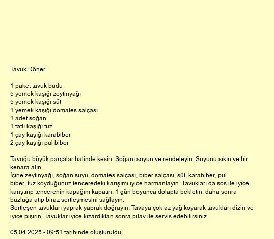 İçine zeytinyağı, soğan suyu, domates salçası, biber salçası, süt, karabiber, pul biber, tuz koyduğunuz tenceredeki karışımı iyice harmanlayın. Tavukları da sos ile iyice karıştırıp tencerenin kapağını kapatın. 1 gün boyunca dolapta bekletin, daha sonra buzluğa atıp biraz sertleşmesini sağlayın.