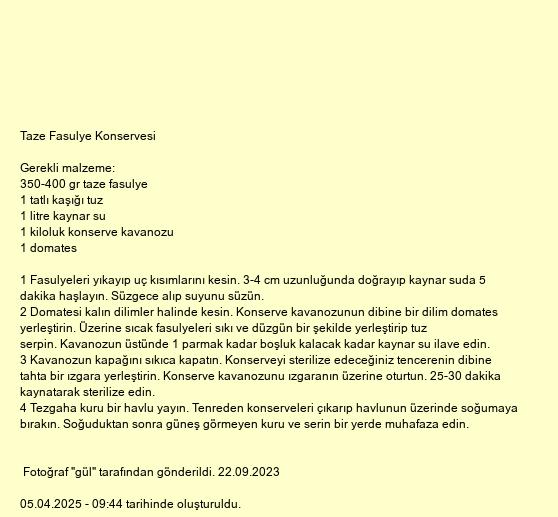 2 Domatesi kalın dilimler halinde kesin. Konserve kavanozunun dibine bir dilim domates yerleştirin. Üzerine sıcak fasulyeleri sıkı ve düzgün bir şekilde yerleştirip tuz serpin. Kavanozun üstünde 1 parmak kadar boşluk kalacak kadar kaynar su ilave edin.
