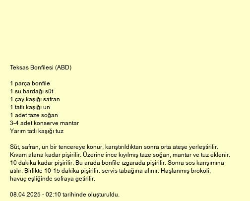 Süt, safran, un bir tencereye konur, karıştırıldıktan sonra orta ateşe yerleştirilir. Kıvam alana kadar pişirilir. Üzerine ince kıyılmış taze soğan, mantar ve tuz eklenir. 10 dakika kadar pişirilir. Bu arada bonfile ızgarada pişirilir. Sonra sos karışımına atılır. Birlikte 10-15 dakika pişirilir. servis tabağına alınır. Haşlanmış brokoli, havuç eşliğinde sofraya getirilir.
