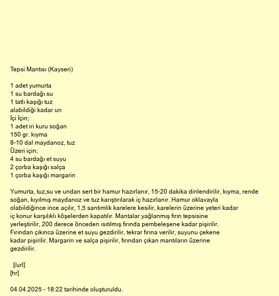 Yumurta, tuz,su ve undan sert bir hamur hazırlanır, 15-20 dakika dinlendirilir, kıyma, rende soğan, kıyılmış maydanoz ve tuz karıştırılarak iç hazırlanır. Hamur oklavayla olabildiğince ince açılır, 1,5 santimlik karelere kesilir, karelerin üzerine yeteri kadar iç konur karşılıklı köşelerden kapatılır. Mantalar yağlanmış fırın tepsisine yerleştirilir, 200 derece önceden ısıtılmış fırında pembeleşene kadar pişirilir. Fırından çıkınca üzerine et suyu gezdirilir, tekrar fırına verilir, suyunu çekene kadar pişirilir. Margarin ve salça pişirilir, fırından çıkan mantıların üzerine gezdirilir.