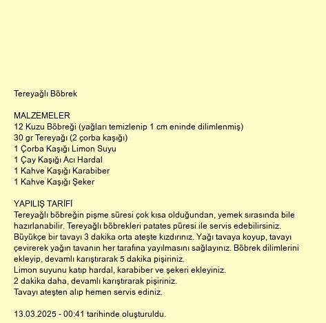 Tereyağlı böbreğin pişme süresi çok kısa olduğundan, yemek sırasında bile hazırlanabilir. Tereyağlı böbrekleri patates püresi ile servis edebilirsiniz.