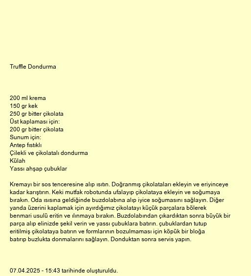 Kremayı bir sos tenceresine alıp ısıtın. Doğranmış çikolataları ekleyin ve eriyinceye kadar karıştırın. Keki mutfak robotunda ufalayıp çikolataya ekleyin ve soğumaya bırakın. Oda ısısına geldiğinde buzdolabına alıp iyice soğumasını sağlayın. Diğer yanda üzerini kaplamak için ayırdığımız çikolatayı küçük parçalara bölerek benmari usulü eritin ve ılınmaya bırakın. Buzdolabından çıkardıktan sonra büyük bir parça alıp elinizde şekil verin ve yassı çubuklara batırın. çubuklardan tutup eritilmiş çikolataya batırın ve formlarının bozulmaması için köpük bir bloğa batırıp buzlukta donmalarını sağlayın. Donduktan sonra servis yapın.