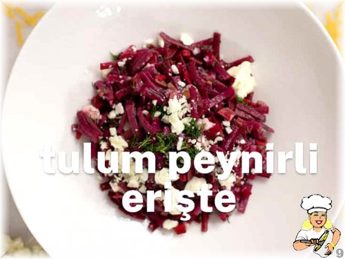 Eriştelerimiz pişti. Tulum peyniri ve dereotunu tencereye ekliyoruz, güzelce karıştırıyoruz. Tulum Peynirli Erişte servis etmek için hazır.