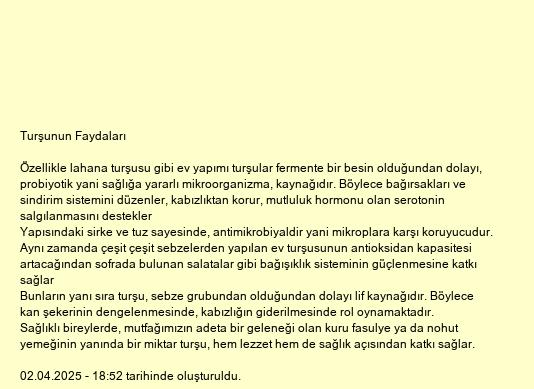 Özellikle lahana turşusu gibi ev yapımı turşular fermente bir besin olduğundan dolayı, probiyotik yani sağlığa yararlı mikroorganizma, kaynağıdır. Böylece bağırsakları ve sindirim sistemini düzenler, kabızlıktan korur, mutluluk hormonu olan serotonin salgılanmasını destekler