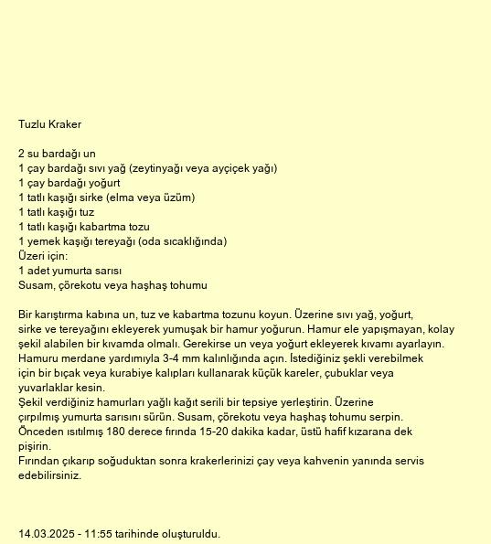 Fırından çıkarıp soğuduktan sonra krakerlerinizi çay veya kahvenin yanında servis edebilirsiniz.