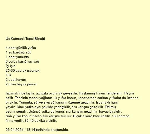 Ispanak ince kıyılır, az tuzla ovularak gevşetilir. Haşlanmış havuç rendelenir. Peynir ezilir. Tepsinin tabanı yağlanır. ilk yufka konur, kenarlardan sarkan yufkalar da üzerine bırakılır. Yumurta, süt ve sıvıyağ karışımı üzerine gezdirilir. Ispanaklı harç yayılır. İkinci yufka aynı şekilde yerleştirilir, sıvı karışım gezdirilir. Ezilmiş peynir serpilir. Üçüncü yufka da konur, sıvı karışım gezdirilir, havuç bırakılır. Son yufka konur. Kalan sıvı karışım sürülür. Bıçakla kare kare kesilir. 180 derece fırına verilir. 35-40 dakika pişirilir.